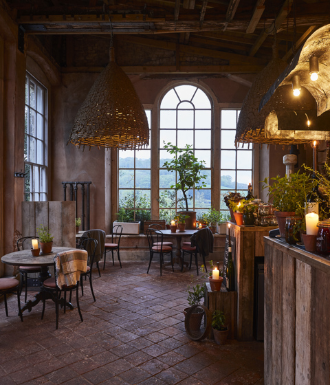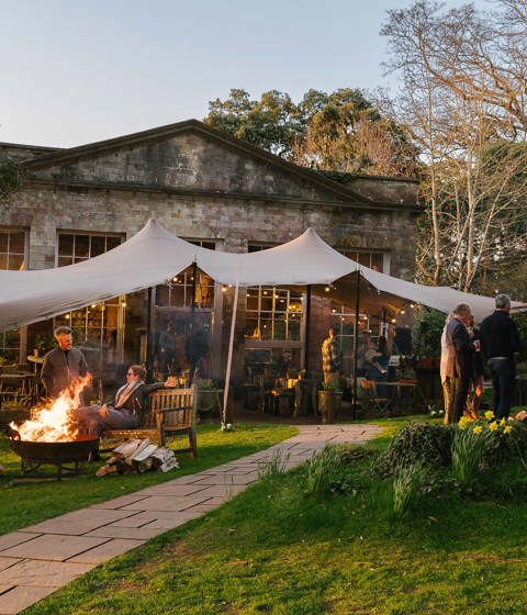 With rustic, reclaimed tables and chairs indoors and outdoors, The Folly is open come rain or shine – there is a log burning stove inside and an under-canvas cover.