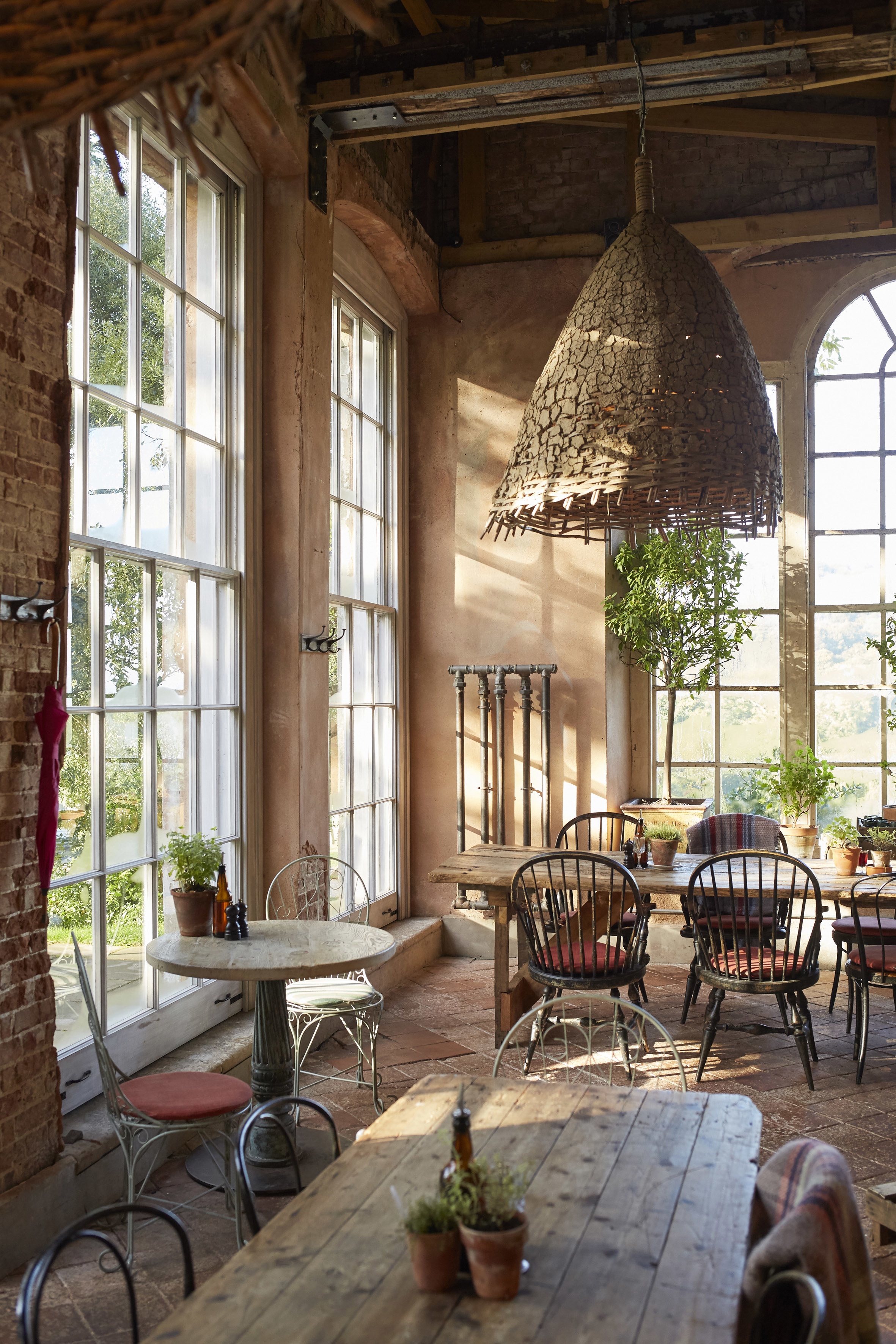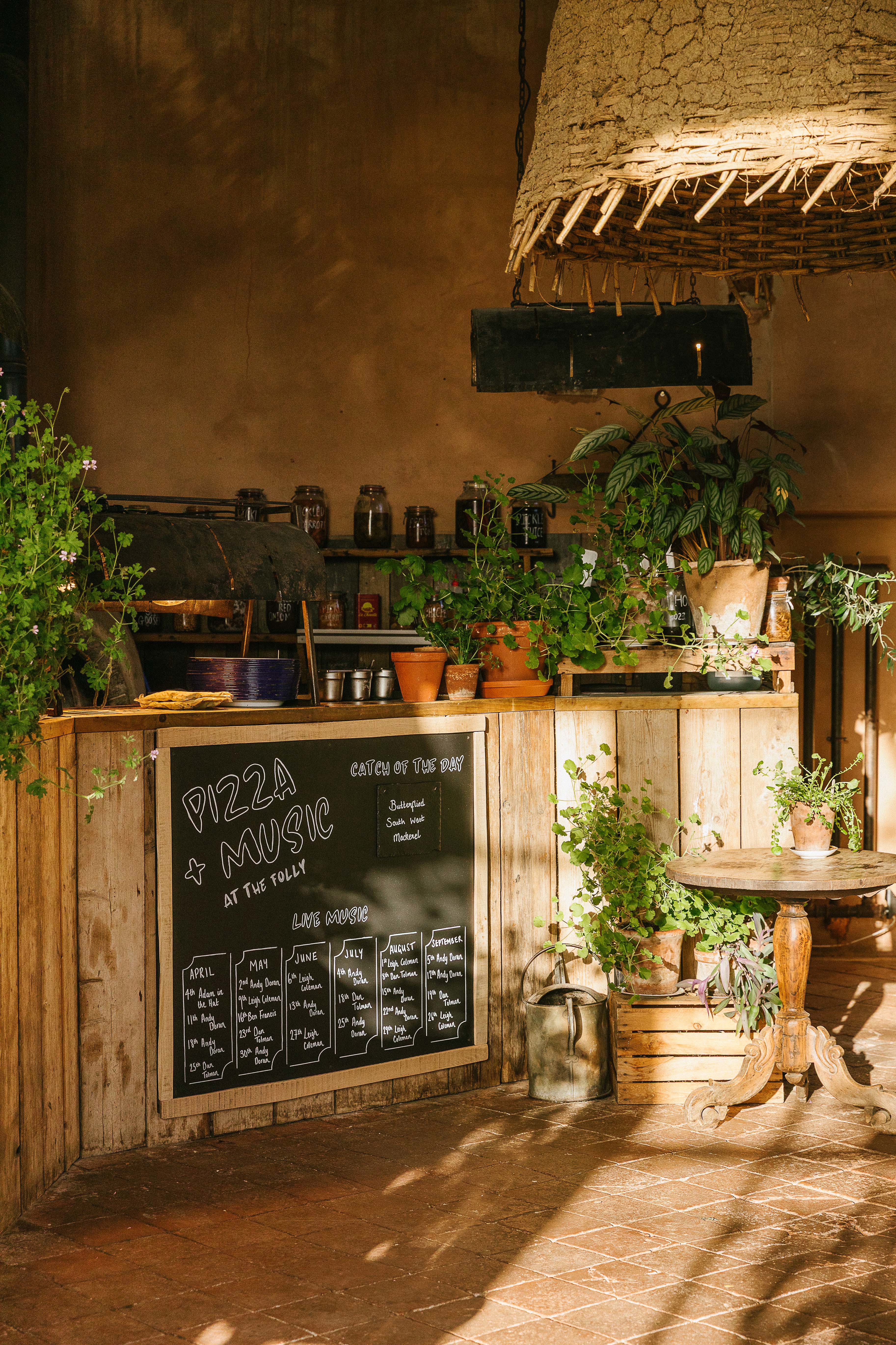 With rustic, reclaimed tables and chairs indoors and outdoors, The Folly is open come rain or shine – there is a log burning stove inside and an under-canvas cover.